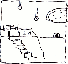 The way they designed this, you climb up the big trapezoid and the tables are up there. That’s where you sit when you eat. Then the big yellow cylinders are the trash, and you have to throw out your trash and put the tray away by yourself.