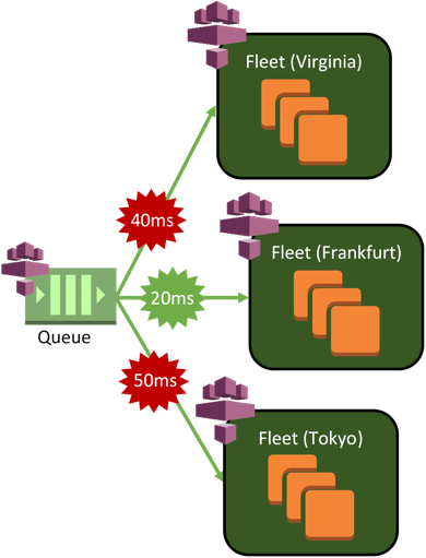 Once FlexMatch has found a group of players that meet your matchmaking rule set requirements, it will create a game session placement request and place this in to a queue to find the lowest latency game server for the match. FlexMatch is wired up to Amazon GameLift Queues to automate the process of efficiently allocating new game sessions onto game servers.